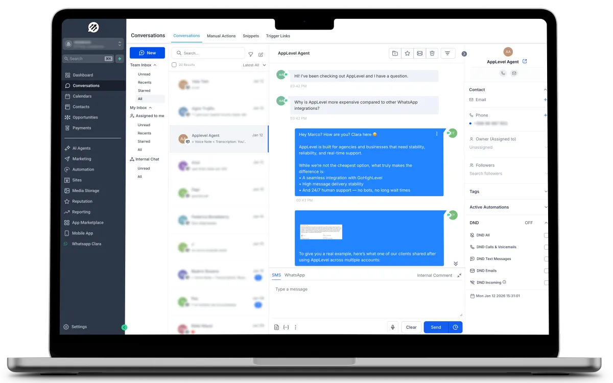 Automate conversations, sync them with your GoHighLevel CRM, and prevent chats from getting lost on your team’s phones.